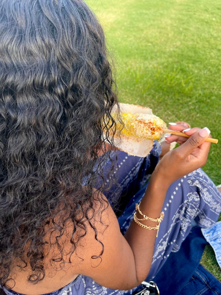 Norfolk’s Latino Music Festival was truly a wonderful experience and a thrilling celebration of the Latin culture. It was everything that I envisioned with lots of vendors, great entertainment, and a beautiful summer day by the water. But, one of the most important things to do before going to any festival is to find the perfect outfit to make the most out of your festival experience. With that in mind, I began aimlessly searching for a free flowing jumpsuit. I wanted this jumpsuit to float with the wind and move with me while I was dancing to the music. Luckily for me, I found the perfect one piece to showcase at the festival. This serene, blue jumpsuit had the perfect level of comfort and overall style. The simplistic, cream embellishments were just the right amount of flare, allowing the movement of the jumpsuit to really stand out. The additional flap on the top of the one piece added volume and texture to the overall look. The gold accessories also accented the simplistic elegance of the outfit. I definitely recommend finding an outfit that is very comfortable so that you will be able to enjoy all the activities at the festival. I also recommend wearing flat shoes because you’ll be doing a lot of walking around to check out the different vendors. I chose cream, crochet styled sandals that were dressy enough but also good for walking. My ensemble allowed me to enjoy all the aspects of the festival, especially the food.